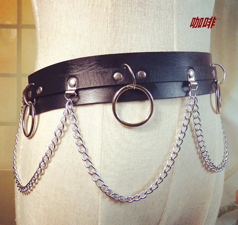 2018 New Punk Gothic Faux Leather Belt Metal Chain Ring Waist Strap Street Dance Decor