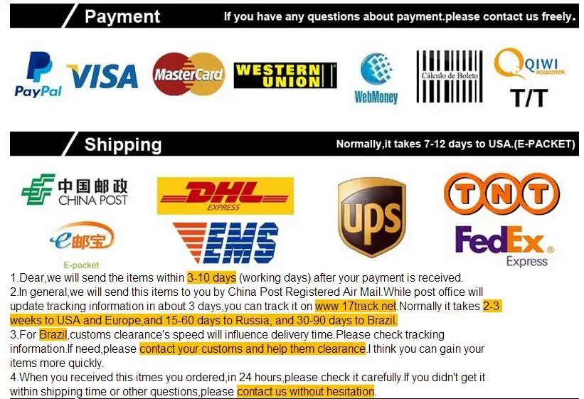Packages from our warehouse in China will be shipped by ePacket or EMS depending on the weight and size of the product. Packages shipped from our US warehouse are shipped through USPS.