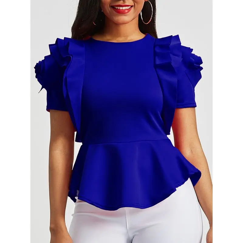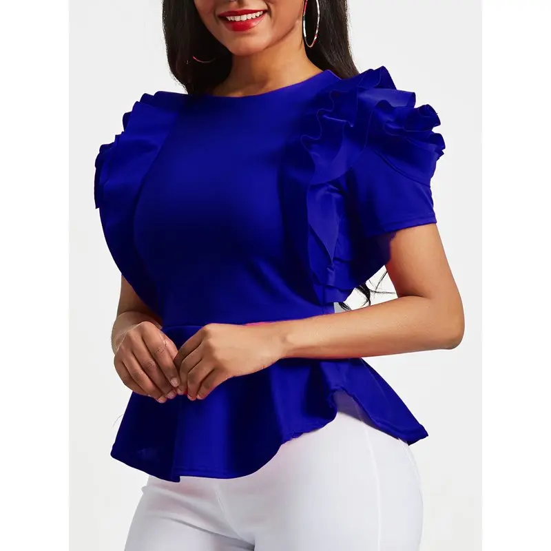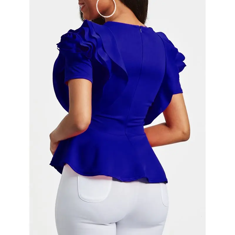 African Women Office Lady Work High Street Summer Cascading Ruffle Slim Blouses Shirts Tops Retro Royal Blue Blouse Shirt Top