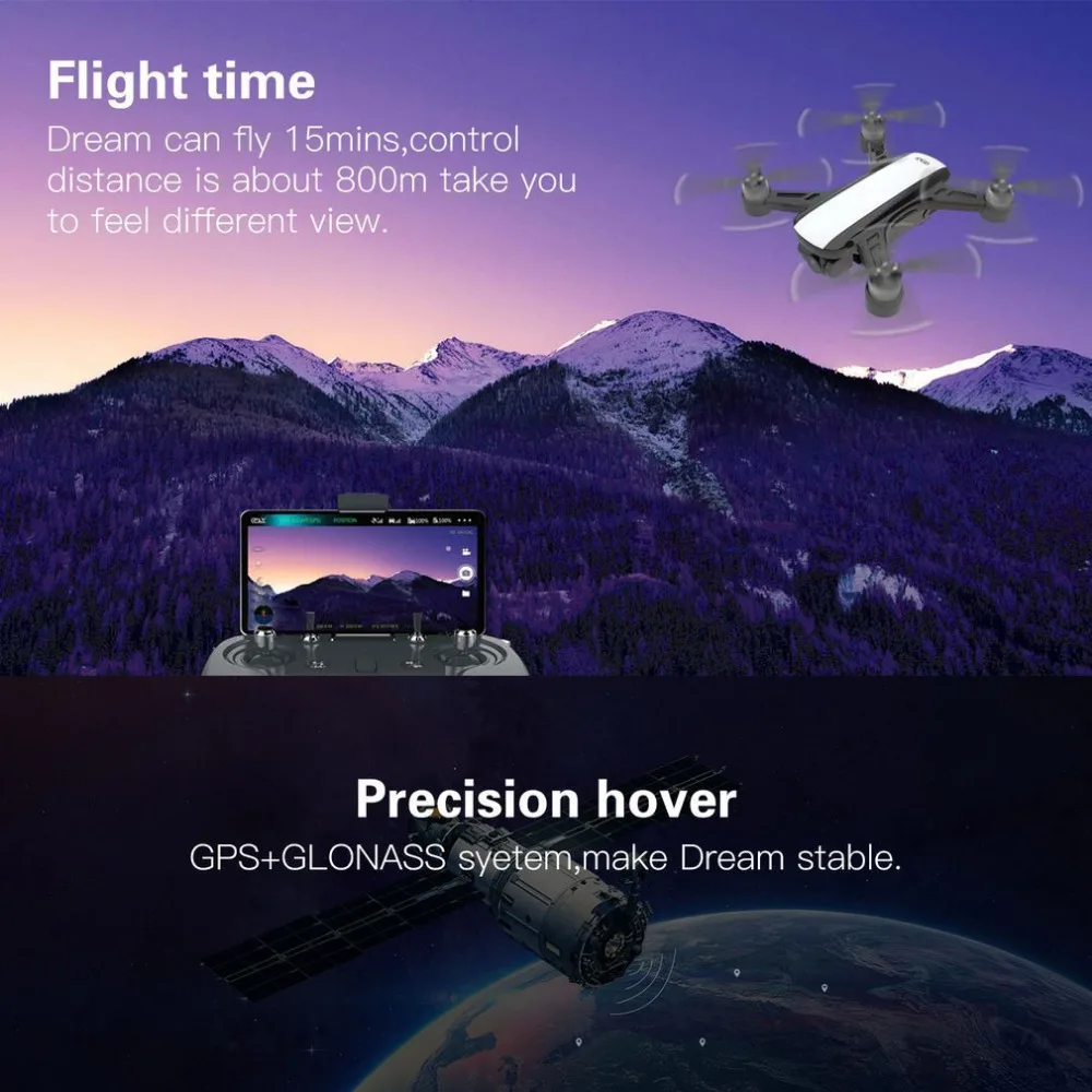 2 Long flight time and distance: Dream can fly 15mins and the controlling distance is about 800m, take you to feel different view.