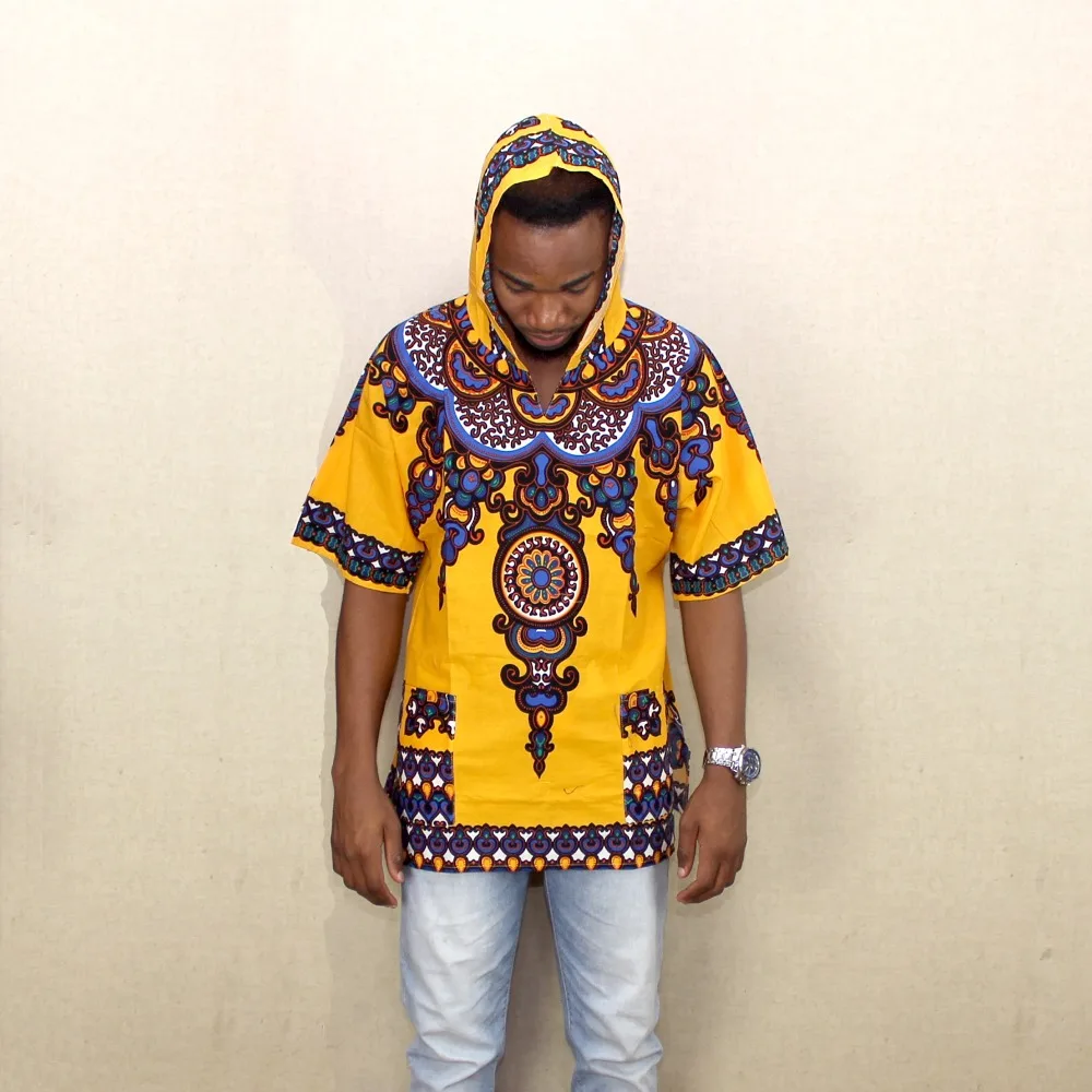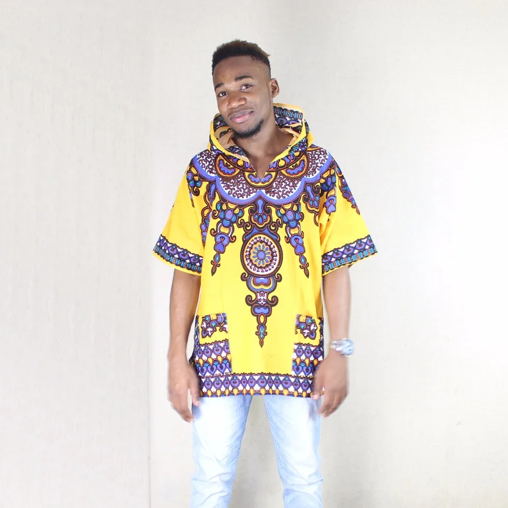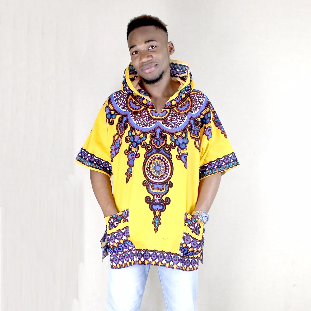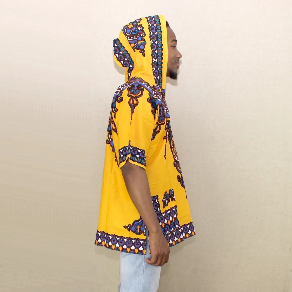 Dashikiage Yellow Mens Hipster Hip Hop African Dashiki Fabric Elongated longline Hoodie t shirt Hoody