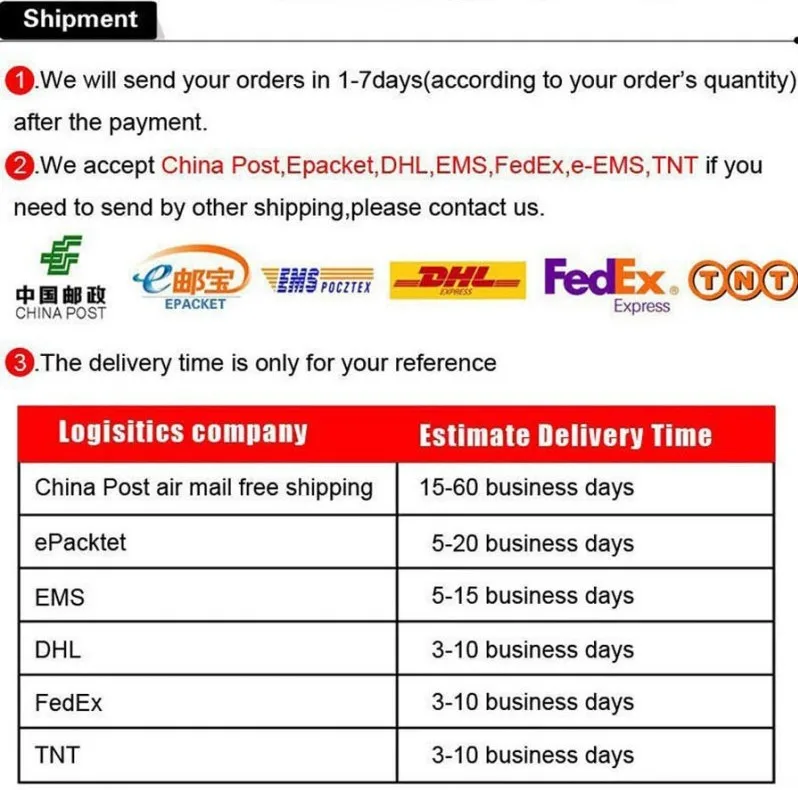 Packages from our warehouse in China will be shipped by ePacket or EMS depending on the weight and size of the product. Packages shipped from our US warehouse are shipped through USPS.
