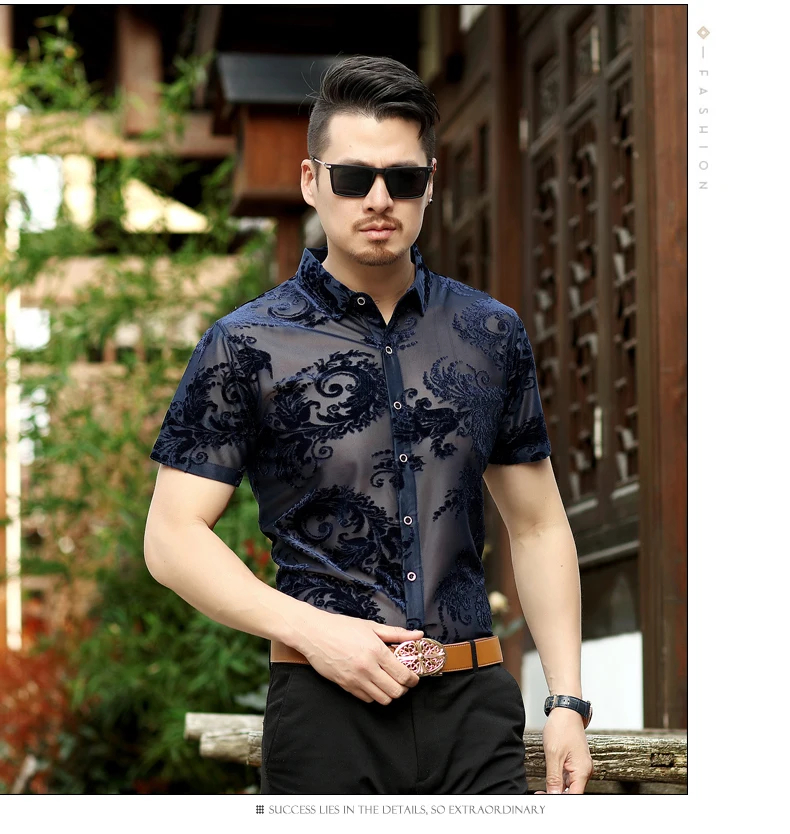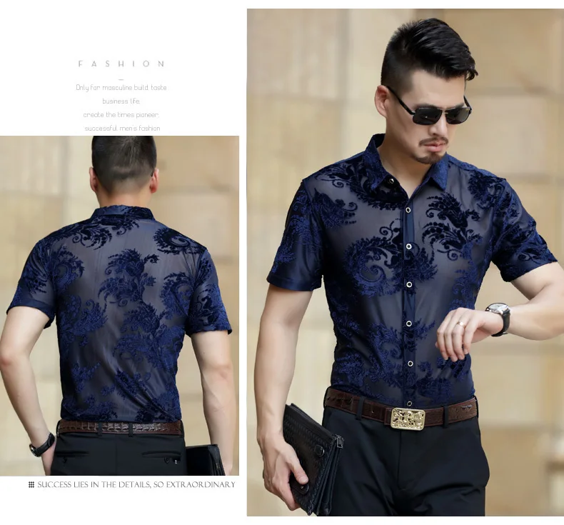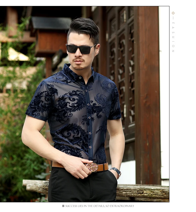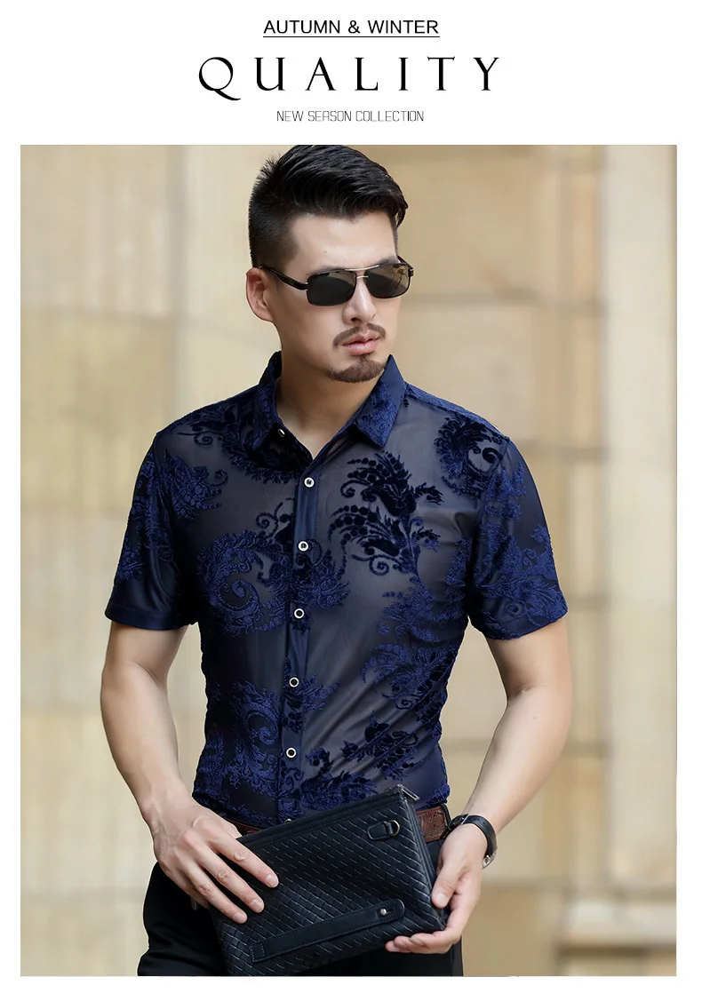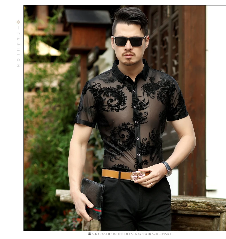 Flower See Through Shirt Paisley Pattern 2018 Short Sleeve Summer Sexy Prom Transparent Shirt Camisa Masculina Chemise Homme