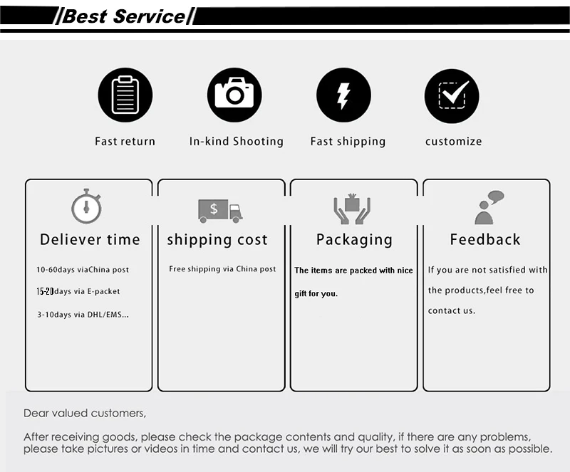 • If you did not receive the product within the guaranteed time( 45 days not including 2-5 day processing) you can request a refund or a reshipment.