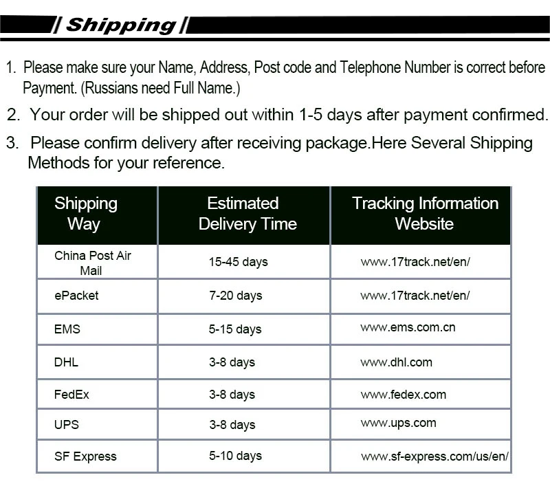 Packages from our warehouse in China will be shipped by ePacket or EMS depending on the weight and size of the product. Packages shipped from our US warehouse are shipped through USPS.
