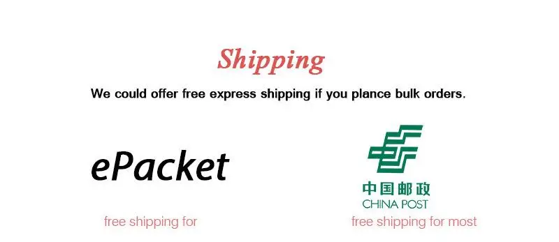 Packages from our warehouse in China will be shipped by ePacket or EMS depending on the weight and size of the product. Packages shipped from our US warehouse are shipped through USPS.