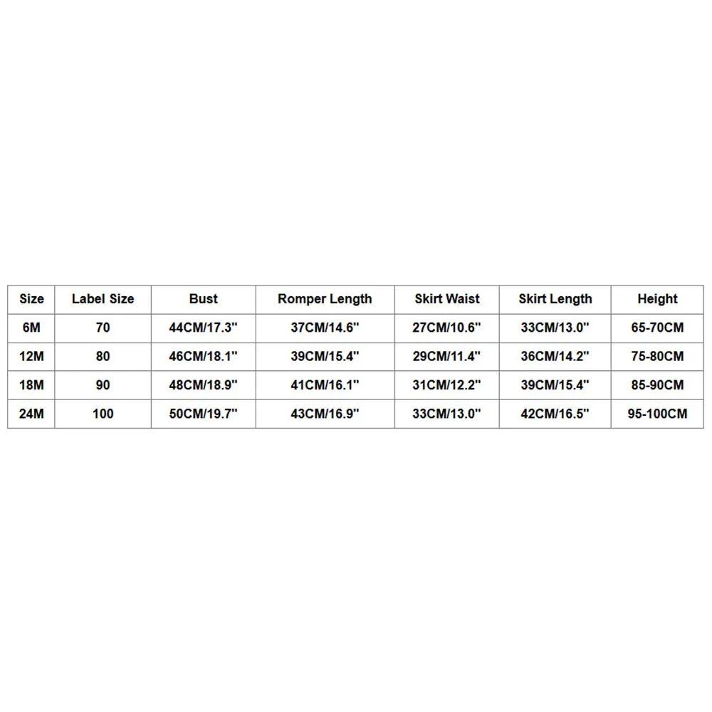 | Size | Label Size | Bust | Romper Length | Skirt Waist | Skirt Length | Height |