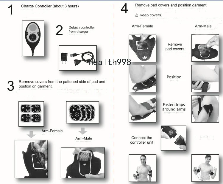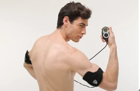 The controller is built in an exclusive chip provided by EMSTARC. Micro-current signals are emitted regularly to the biceps and/or triceps muscle nerves through pads placed on the arms.