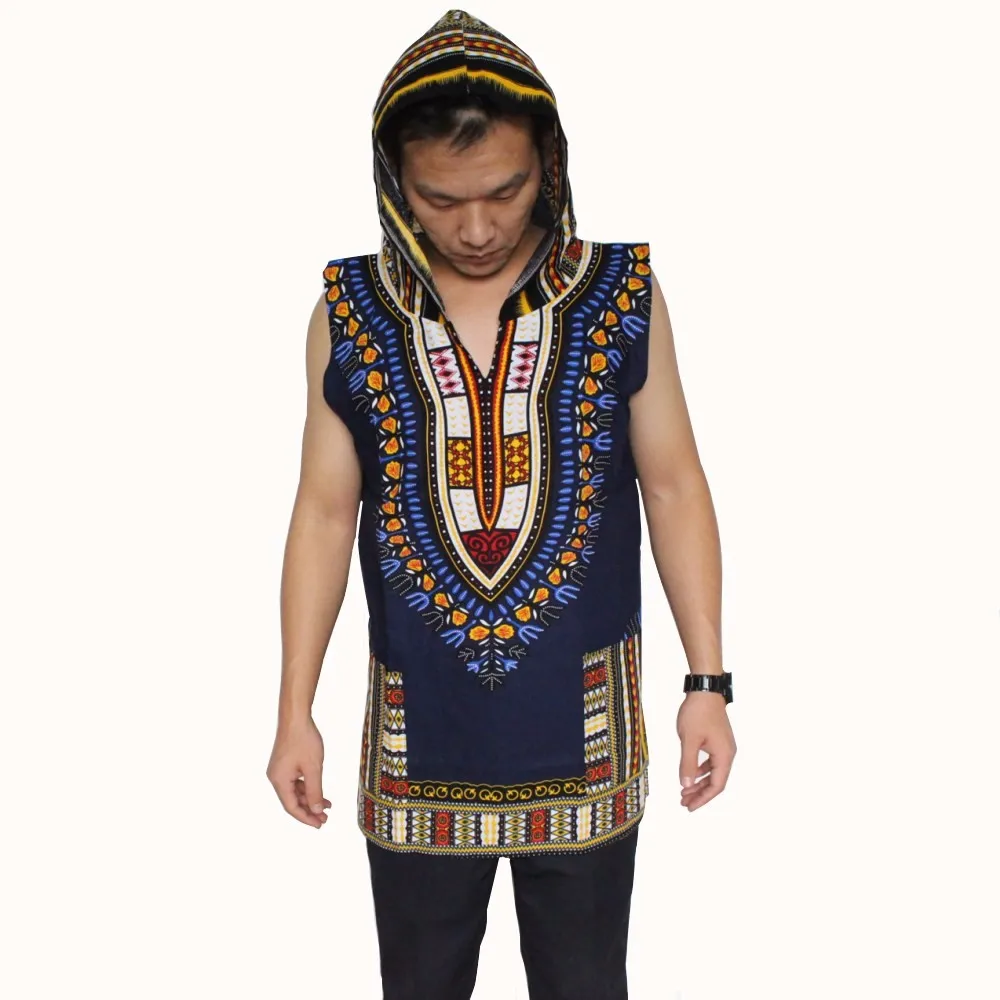 Sleeveless Dashiki Hoodies Loose African Hooded Dashiki Fabric Hoody 100% Cotton Fashion Clothes Unisex Kimono with Pocket