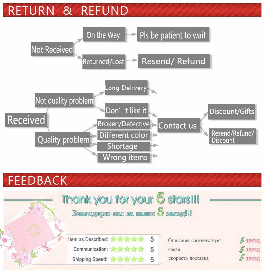 • If you did not receive the product within the guaranteed time( 45 days not including 2-5 day processing) you can request a refund or a reshipment.