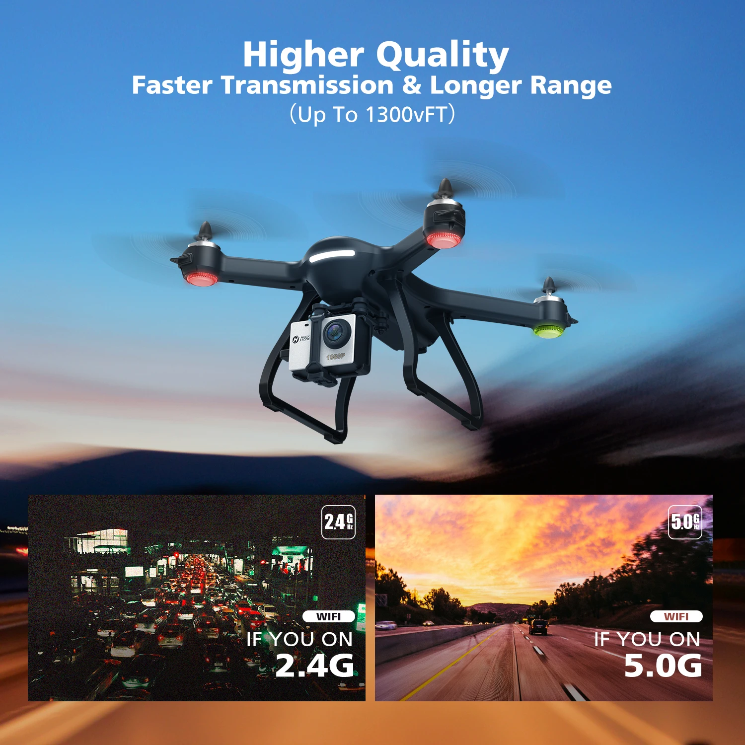 -Advanced 1080P FHD Camera: The upgraded camera with 110degFOV (field of view) lens gives a panoramic view for recording your unforgettable moment. 5G 1300FT transmission ensures high-quality real time video – ideals for selfie. Gopro 2/3/4 Compatible!