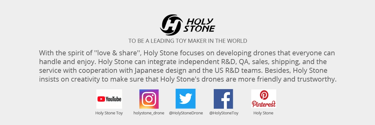 Holy Stone was founded in 2014 and is a professional retailer of high quality products and toys for all age groups. We’re dedicated to offering our customers only the highest quality and most unique and distinctive items. At the same time, we strive to do so at very competitive prices. We then back all of that up with excellent customer service.
