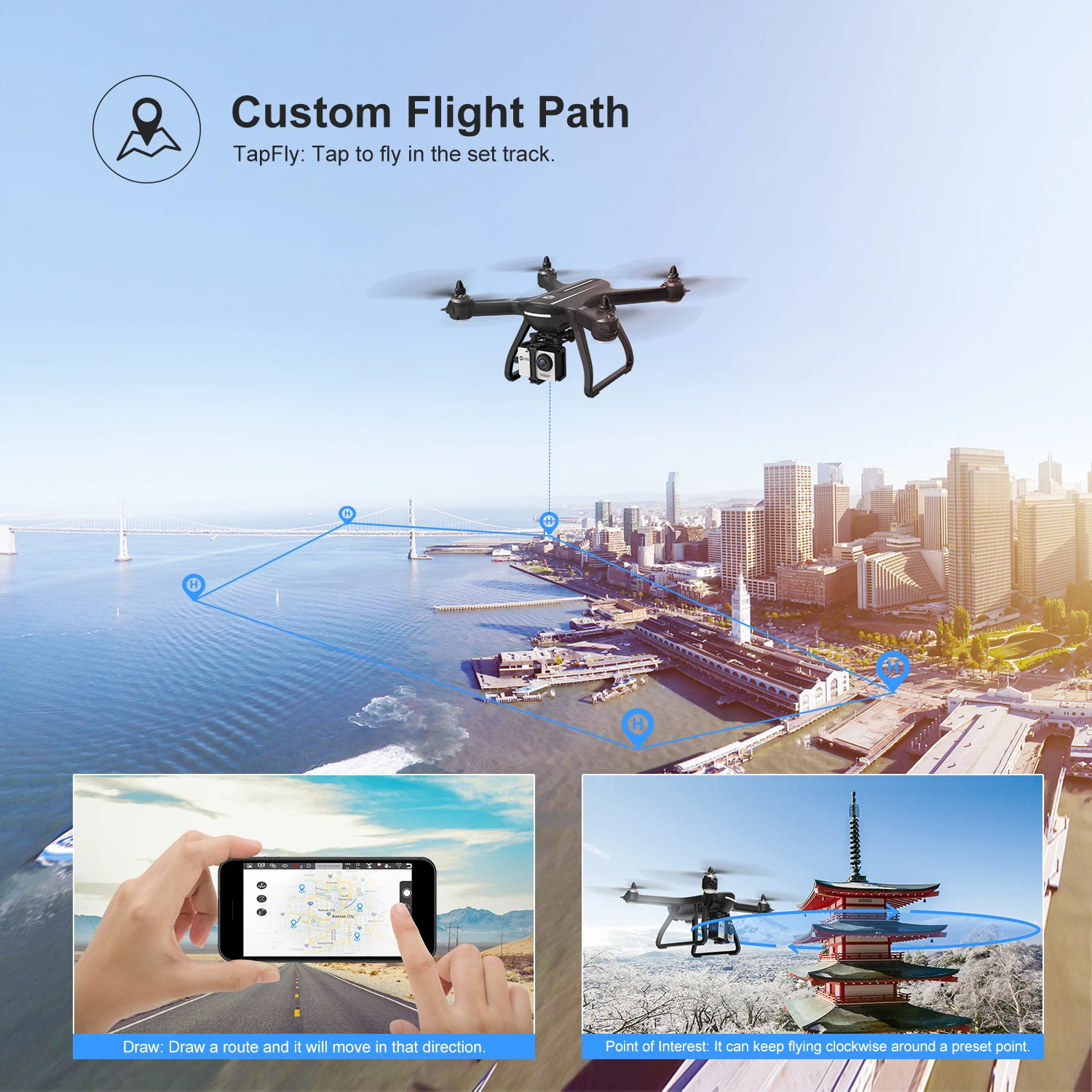 -GPS Assisted Flight: With GPS location, the drone can hover stably and automatically return to Home precisely when its battery is low or the signal is lost. Shot with ease when the drone can follow you or fly in a circle along the path you set.