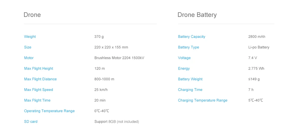 -20 Mins Max Flight Time: The High-capacity 2800mAh intelligent battery yields up to 20mins flight time. It also has low-power alert. You can immersed yourself in a substantial flight.